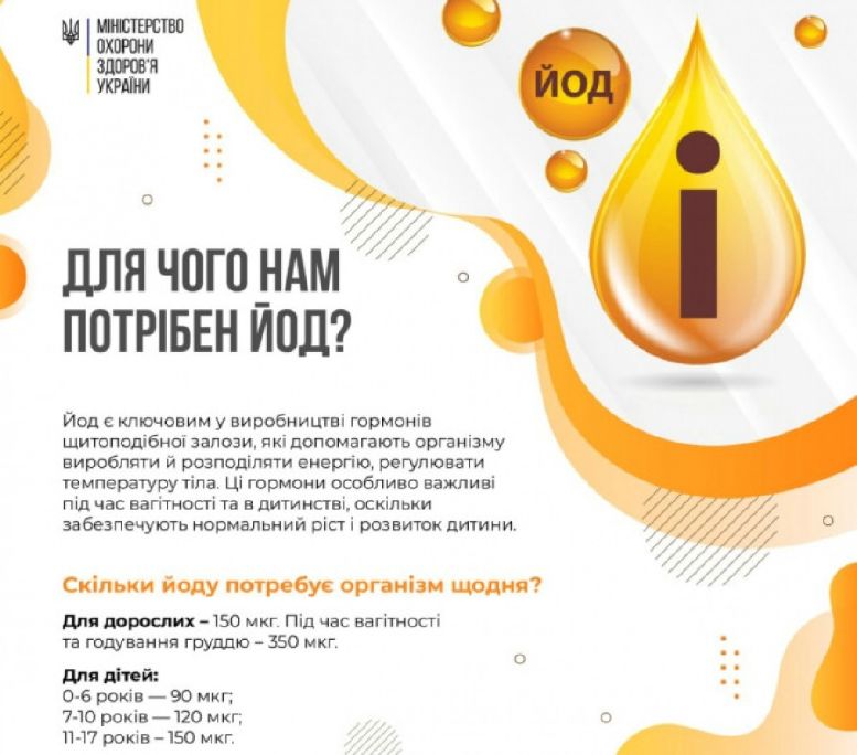 ![]() Січень — місяць обізнаності про щитоподібну залозу. Саме час згадати про йод — один із найвідоміших мікроелементів, без якого неможливе її нормальне функціонування. Левова частка йоду в нашому тілі зберігається саме в щитоподібній залозі, яка розташована в передній частині шиї. Вона виробляє групу гормонів, що називаються гормонами щитоподібної залози або тиреоїдними гормонами. Фактично, йод є ключовим у їхньому синтезі. Такі гормони впливають на загальний метаболізм. Зокрема, допомагають організму виробляти й розподіляти енергію та регулювати температуру тіла. Вони особливо важливі під час вагітності та в дитинстві, оскільки забезпечують нормальний ріст і розвиток (зокрема, і розумовий — у дітей). Щоб уникнути дефіциту йоду до щоденного меню слід регулярно включати: морепродукти (мідії, кальмари, креветки, ікру); білу рибу (минтай, хек, тріску тощо); морську капусту (ламінарію); овочі (картоплю, редиску, часник, буряк, томати, баклажани, спаржу, зелену цибулю, щавель, шпинат); фрукти (банани, апельсини, лимони, дині, ананаси, хурму, фейхоа); яйця; молоко; яловичину; волоські горіхи. Деяким людям може бути важко отримати достатню кількість йоду з харчування, через збільшення потреб або обмежені джерела їжі. Дефіцит йоду може вплинути на здоров’я в будь-якому віці. Достатня кількість цього мікроелементу особливо необхідна під час вагітності та у ранньому дитинстві (до 3 років), оскільки нестача може погіршити ріст і розвиток дитини, зокрема розвиток мозку та нервової системи. |
