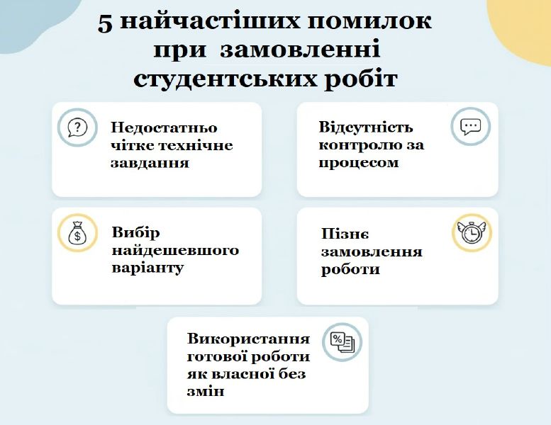 Співпраця із сервісами з написання студентських робіт – це допомога з домашнім завданням, економія часу та сил, але лише за умови правильного підходу. Через неуважність і поспіх студенти часто повторюють типові помилки і псують собі підсумкову оцінку. У цій статті розглянемо п’ять найпоширеніших проблем і способи, як їх уникнути. Помилка 1: Вибір найдешевшого варіантуБажання зекономити часто грає злий жарт зі студентами. Надто низька ціна за курсову чи дипломну роботу може свідчити про використання шаблонів або неоригінальних матеріалів. Результат – студента ловлять на плагіаті, і взагалі є велика ймовірність втратити гроші. Що робити? Обирайте перевірених авторів із реальними відгуками та гарантіями доопрацювань, навіть якщо ціна трохи вища. Зробіть аналіз інформації на студентських форумах, дошках оголошень. Інколи достатньо просто запитати у чаті. Помилка 2: Недостатньо чітке технічне завданняНечітке або поверхове технічне завдання часто стає причиною того, що студент отримує роботу «не за темою». Автор не володіє магією та не вміє читати думки. Щоб результат відповідав вимогам університету, слід детально описати ТЗ: