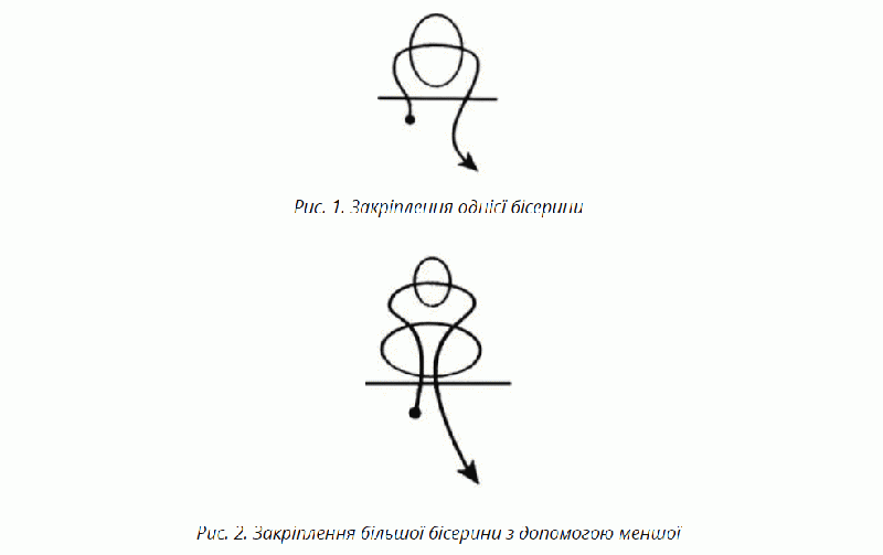 Ці принципи використовуються і в простій вишивці. Розглянемо, основні методи закріплення бісеру на тканині. Якщо закріплювати бусинки по одній, то робота ґудзичком, буде простою та легко закріплюватиме їх. Або ж з допомогою меншої закріплювати більшу.