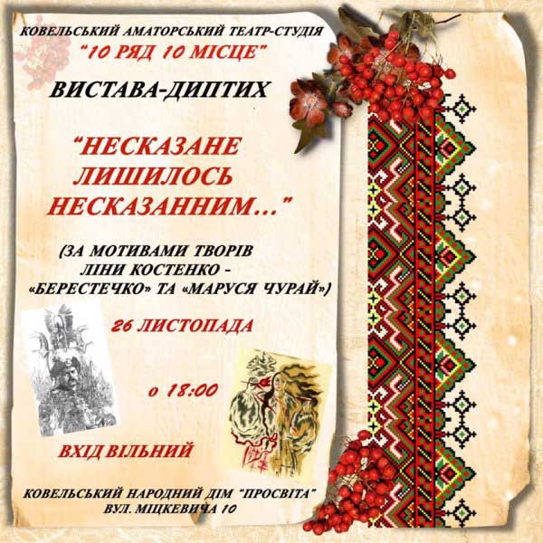 Ковельський експериментальний театр «10 ряд 10 місце» підготував нову виставу. Це вже четверта велика постановка театру. ![]() Аматори сцени запрошують ковельчан 26 листопада у народний дім "Просвіта" на диптих-виставу за мотивами історичних романів відомої української письменниці та поетеси Ліни Костенко - «Берестечко» та «Маруся Чурай» під назвою «Несказане лишилось несказанним…». Початок о 18.00. читайте також: У КОВЕЛІ ОРГАНІЗУВАЛИ САМОДІЯЛЬНИЙ ТЕАТР СТУДІЮ Онлайн-трансляцію вистави дивіться на сайті Kovel.tv о 18.00. |