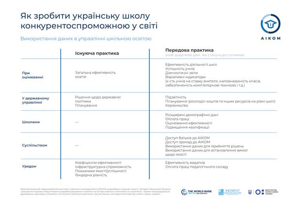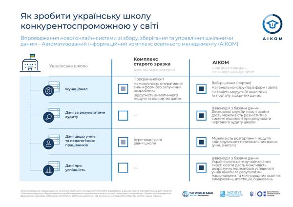 19 липня в Українському кризовому медіа-центрі (м. Київ) відбулась презентація нової онлайн-системи зі збору, зберігання, управління та використання освітніх даних, мета якої підвищити ефективність шкіл та поліпшити якість навчання. ![]() Онлайн-система – Автоматизований інформаційний комплекс освітнього менеджменту (АІКОМ) – була розроблена Інститутом освітньої аналітики, який є підрозділом Міністерства освіти і науки, у рамках гранту Світового Банку. У Ковелі до АІКОМ буде підключено усі 14 шкіл і 14 дитячих садочків, а по Волинській області 629 і 485 відповідно. Загалом в Україні за новою системою працюватимуть понад 15,5 тис. закладів середньої і майже 15 тис. закладів дошкільної освіти. Необхідність заміні старої системи продиктовано освітньою реформою, яка передбачає розвиток української освіти згідно із міжнародними стандартами та створенням Нової української школи, навчальна програма якої має ґрунтуватися на набутті учнями ключових життєвих компетентностей. «Сьогодні Україна має небагато даних щодо якості освіти порівняно з іншими країнами, - зазначив важливість системи начальник головного управління загальної середньої та дошкільної освіти директорату дошкільної та шкільної освіти Міністерства освіти і науки України Юрій Кононенко. – Відсутність повної інформації позбавляє центральні і місцеві органи влади можливості ухвалювати якісні управлінські рішення на основі ґрунтовного аналізу, а батькам складніше визначити найкращу школу для своїх дітей». У порівнянні із попередньою інформаційною системою, АІКОМ може збирати набагато більший обсяг даних: бюджет школи, витрати на одного учня, відвідуваність учнів, рівень оплати праці, оцінювання ефективності та підвищення кваліфікації вчителів тощо. Форми збору даних легко змінюються, їх передача в центральну базу здійснюватиметься з будь-якого комп'ютера, підключеного до Інтернету і не потребує спеціального програмного забезпечення. Наявність порталу відкритих даних дає змогу всім бажаючим бачити і опрацьовувати дані у вигляді графіків та звітів. «Нова система спростить школам складання статистичної звітності та дасть можливість аналізувати свою ефективність в порівнянні з минулими періодами та іншими закладами, - підкреслює наслідки запровадження АІКОМ директор Інституту освітньої аналітики Сергій Лондар. – А освітні управлінці зможуть краще розподіляти кошти та забезпечувати заклади усім необхідним для надання якісних освітніх послуг». Експерти переконані, що існуюче узагальнене представлення даних і обмежена кількість показників ускладнюють аналіз якості освіти та ефективності витрат коштів платників податків. «Неурядовим організаціям і дослідникам наразі складно об'єктивно оцінювати школи, оскільки частина необхідних даних є у відкритому доступі, але на різних ресурсах, решта – внутрішня інформація, яка переважно не публікується», - говорить експерт з економічних питань Центру соціально-економічних досліджень CASE Україна Поворозник Василь. «На етапі старту реформи освіти не була відома навіть точна кількість закладів, бо різні джерела статистики давали різні дані. Коли йдеться про фінансування шкіл, то практично неможливо отримати зведені дані (оскільки кошти надходять з різних джерел) та відстежити витрати, - зауважила співголова ГО "Ба