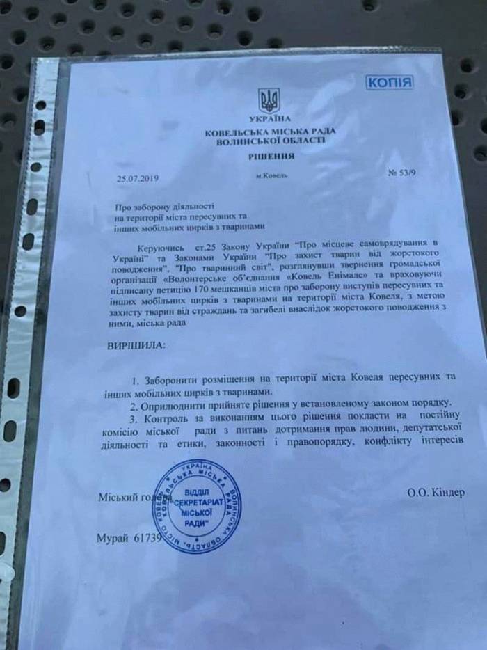 Ковель — одне з перших міст України, де 25.07.2019 р. міською радою було прийнято рішення «Про ЗАБОРОНУ діяльності на території міста пересувних та інших мобільних цирків з тваринами». ![]() Рішення було напрацьоване для захисту тварин від страждань та загибелі внаслідок жорстокого поводження з ними, після звернення громадської організації «Волонтерське об’єднання «Ковель Енімалс». петиції, яку підписали 170 мешканців міста. Дивіться також: У КОВЕЛІ ЗАБОРОНИЛИ ПЕРЕСУВНІ ЦИРКИ ІЗ ТВАРИНАМИ ![]() Однак, 26 вересня активісти ГО «Kovel Animals» помітили черговий пересувний цирк з тваринами у місті, а також афіші, флаери, та продаж квитків на шоу, - повідомили волонтери у Facebook. ![]() "По факту, перед в’їздом у місто, цирк бере дозвіл у міської влади, без якого його перебування на території міста не є правомірним. У даному випадку органи самоврядування запевнили, що дозвіл не видавали, а далі... у ході однієї з телефонних розмов з представником влади, ми почули слідуюче: «цирк знаходиться на приватній території (у межах міста, де діє заборона) якщо шоу будуть проведені, то буде скликана комісія, на якій щось там має вирішуватись, але не з цирком, а з власником земельної ділянки, на який проведуть дійство... (постфактум) Цікаво виходить, є рішення, маємо відповідні органи, що слідкують за його виконанням і ... цирк з тваринами, що вже успішно продає квитки. Питання, чому бездіє міська влада, депутатська комісія, та правоохоронні органи, адже відбувається грубе порушення. Чи можливо, є зацікавлені особи, інакше яким чином пояснити відсутність реакції з боку можновладців? Звертаємось до вищевказаних представників влади: «виконуйте свою роботу згідно чинного законодавства України», якщо є рішення, то слідкуйте за його виконанням! Цирк з тваринами знаходиться на території міста і те, що земля приватна, не знімає заборони. ![]() ![]() Далі вирішувати вам, хочете шоу з тваринами, то будьте готові до шоу з плакатами, телебаченням, пресою, та звинуваченнями у корупційних діях", - йдеться у повідомленні. |