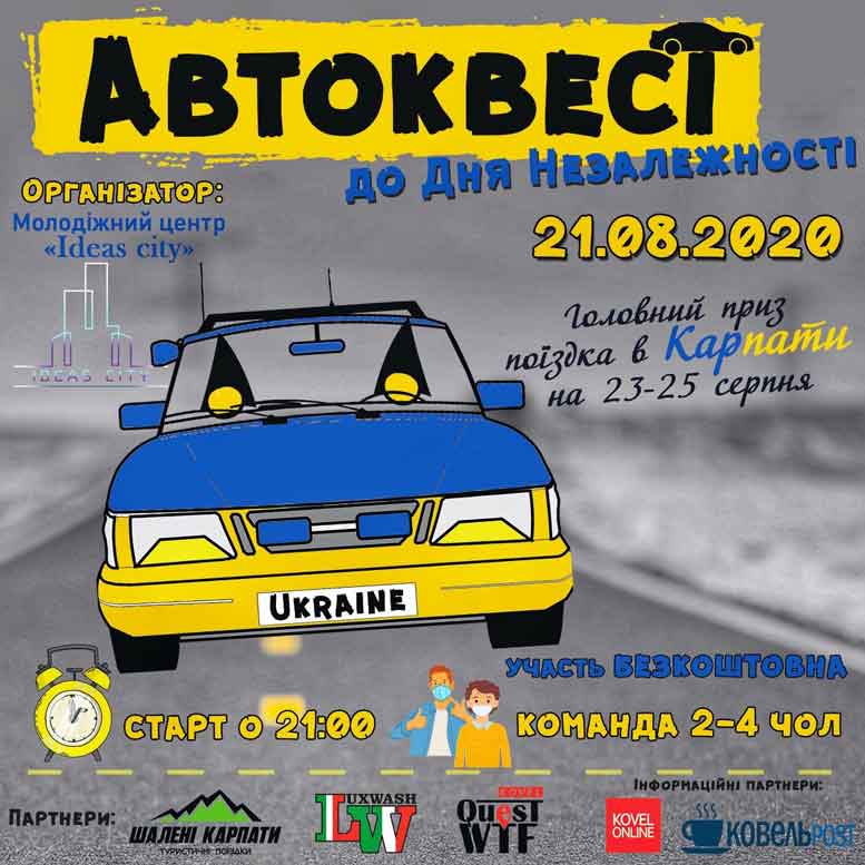 У Ковелі До Дня Незалежності України Молодіжний центр «Місто ідей» разом з відділом культури готують цікаву патріотичну програму – квест на автомобілях. ![]() Захід відбудеться 21 серпня о 21.00 год. Детальна інформація та правила гри - у формі для реєстрації учасників, яка буде відкритою до 20 години 20 серпня: forms.gle/dDVxn37Drg691Vnf7 До участі запросять перші 24 зареєстровані команди. Тому приймайте рішення швидше і переходьте за посиланням. На учасників чекають шалені враження, море адреналіну, а також захоплюючі, несподівані та патріотичні завдання. ⠀ Головний приз для команди, яка фінішуватиме першою - поїздка в КАРПАТИ на 3 дні (23-25 серпня). Такий подарунок підготували для вас відділ культури, Молодіжний центр «Місто ідей» та партнер заходу «Туристичні поїздки «Шалені Карпати». ⠀ Команди, які займуть 2-е та 3-є місця, отримають призи-сюрпризи від спонсора квесту – відділу культури та його організатора – Молодіжного центру. Інших учасників чекають подарунки від партнерів заходу – автомийки Luxwash_kovel. ⠀⠀ «Реєструйся, адже хто знає, куди твою команду приведе КВЕСТ...на вир нових емоцій? до нових знайомств? до нового хобі? чи навіть на Говерлу? Все залежить тільки від тебе тому:⠀ - заповнюй реєстраційну форму (в шапці профілю); - збирай команду (бажано 4 людини, адже 2 голови добре, а 4 – ще краще). Бери з собою прапор України, мобільний телефон з підключенням до інтернету, ліхтарик та, обов’язково, гарний настрій! До зустрічі на нашому Автоквесті», — закликають організатори з Молодіжного центру «Місто ідей». |