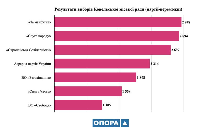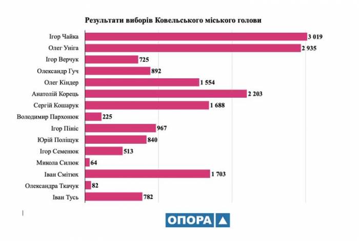 За результатами голосування 25 жовтня у місті Ковель Волинської області серед кандидатів на посаду міського голови найбільшу підтримку здобув висуванець від партії «За майбутнє» Ігор Чайка, а найбільше депутатських мандатів у Ковельській міській раді завоювали представники цієї ж політсили та партії «Слуга народу». ![]() Такі дані отримали представники Громадянської мережі ОПОРА після аналізу протоколів Ковельської ТВК про результати голосування. Обирали Ковельського міського голову 18 560 виборців, котрі 25 жовтня отримали відповідний бюлетень. Однак 368 бюлетенів визнали недійсними (1,99%). За даною кількістю голосів представники ОПОРИ підрахували підтримку кандидатів у відсотках (у відношенні до кількості виборців, котрі взяли участь у голосуванні). Тож найбільшу підтримку серед виборців здобув висуванець партії «За майбутнє» Ігор Чайка – йому віддали свої голоси 3019 виборців, що становить 16,27%. Натомість між іншими кандидатами кількість голосів розподілилася так: Ігор Верчук (Українська народна партія) – 725 голосів (3,91%), Олександр Геч (самовисування) – 892 (4,81%), Олег Кіндер (ВО «Батьківщина») – 1554 голоси (8,37%), Анатолій Корець (самовисування) – 2203 голоси (11,87%), Сергій Кошарук («Європейська Солідарність») – 1688 голосів (9,09%), Володимир Пархонюк – 225 голосів (1,21%), Ігор Пініс («Сила і Честь») – 967 голосів (5,21%), Юрій Поліщук (ВО «Свобода») – 840 голосів (4,53%), Ігор Семенюк (самовисування) – 513 голосів (2,76%), Микола Силюк (самовисування) – 64 голоси (0,34%), Іван Смітюх (Аграрна партія України) – 1703 голоси (9,18%), Олександра Ткачук (самовисування) – 82 голоси (0,44%), Іван Тусь (самовисування) – 782 голоси (4,21%), Олег Уніга («Слуга народу») – 2935 голосів (15,81%). ![]() Ковельська міська рада Відповідно до протоколу про результати виборів депутатів Ковельської міської ради, у голосуванні взяли участь 18 549 виборців. Недійсними під час підрахунку визнали 1373 бюлетені, водночас, не було жодного бюлетеня, котрий не підлягав урахуванню. 5% бар’єр подолали 7 партій. Уподобання виборців між цими політичними силами розподілилися таким чином: «За майбутнє» – 17,16% (2 948 голосів); «Слуга народу» – 16,84% (2 894 голосів); «Європейська Солідарність» – 15,70% (2 697 голосів); Аграрна партія України – 12,89% (2 214 голосів); ВО «Батьківщина» – 11,05% (1 898 голосів); «Сила і Честь» – 9,07% (1 559 голосів); ВО «Свобода» – 6,43% (1 105 голосів). У дужках вказана сумарна кількість голосів виборців, які підтримали всі територіальні виборчі списки кандидатів у депутати від кожної місцевої організації партії в усіх територіальних виборчих округах у межах єдиного багатомандатного округу. ![]() Із 17 176 голосів за списки цих партій у всіх ТВО проголосували 15 315 осіб. Виборча квота становила 494 голоси. Таким чином, «За майбутнє», «Слуга народу» та «Європейська Солідарність» отримали по 1 мандату в кожному із чотирьох округів, Аграрна партія України отримала 3 мандати (за винятком ТВО №3). ВО «Батьківщина» «взяла» мандат в окрузі №4. Від партії «За майбутнє» стали депутатами Сергій Скороход (ТВО №1), Володимир Шпіка (ТВО №2), Валерій Дружинович (ТВО №3), Олена Григола (ТВО №4). Від «Слуги народу» – Андрій Мілінчук (ТВО №1), Андрій Миронюк (ТВО №2), Олег Уніга (ТВО №3), Роман Шворак (ТВО №4). Від «Європейської Солідарності» депутатами стали Тетяна Дружинович (ТВО №1), Сергій Дружинович (ТВО №2), Станіслав Пашкевич (ТВО №3), Олег Козак (ТВО №4). Від Агр