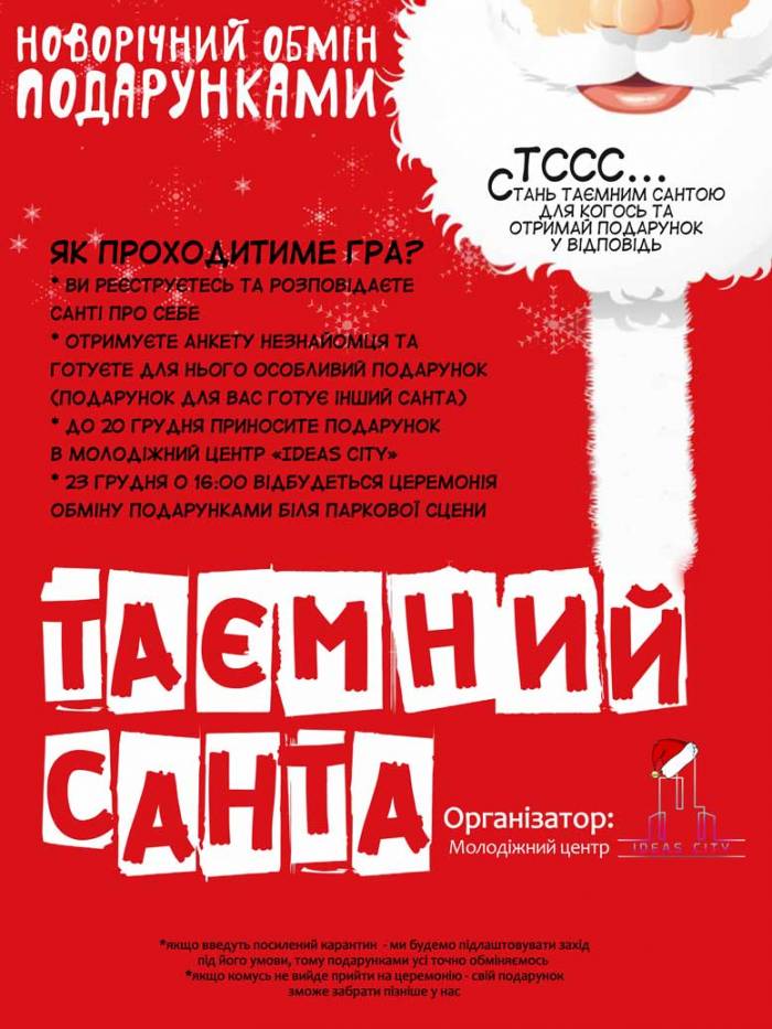 Молодіжний центр "Місто ідей" пропонує ковельчанам віком від 14 років взяти участь у святковому проєкті "Таємний Санта". ![]() "Таємний Санта"– це новорічна церемонія обміну подарунками. За правилами гри ви повинні приготувати сюрприз незнайомцю, а взамін отримаєте презент від свого таємного Санти. Учасником гри може стати кожен, хто любить подарунки та хоче відчути атмосферу Нового року та Різдва. Для участі потрібно зареєструватися та дотримуватись подальших інструкцій. Посилання на реєстрацію: forms.gle/E5Zw9Gav5QUUVzoJ7 |