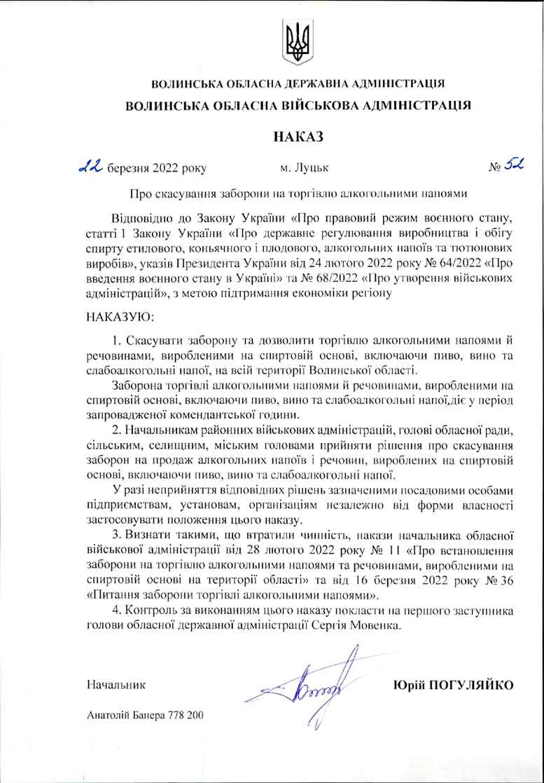 На Волині відтепер знято заборону на продаж алкогольних напоїв. Таке рішення зумовлене лише економічною складовою. ![]() Разом з тим, заборонено продавати алкоголь на території області під час комендантської години з 23:00 до 06:00, - повідомили на сайті Волинської ОДА. |