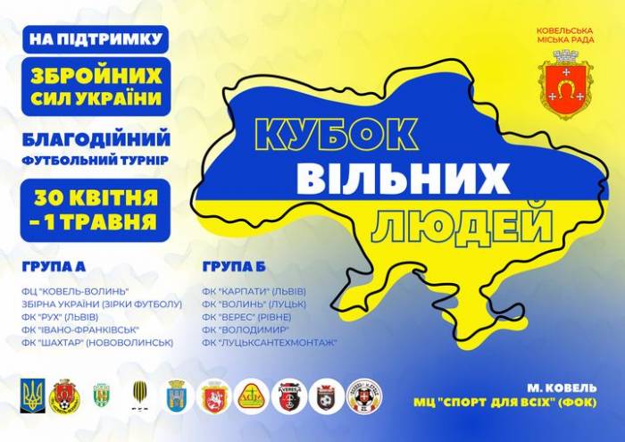У Ковелі на підтримку Збройних Сил України відбудеться благодійний футбольний турнір "Кубок вільних людей". Змагання пройдуть триватимуть 2 дні (30.04-01.05) на полях міського центру "Спорт для всіх" (ФОК). ![]() У турнірі візьмуть участь 10 команд, а саме: ФЦ "Ковель-Волинь", Збірна України (зірки футболу), ФК "Рух" (Львів), ФК "Івано-Франківськ", ФК "Шахтар" (Нововолинськ), ФК "Карпати" (Львів), ФК "Волинь" (Луцьк), ФК "Верес" (Рівне), ФК "Володимир" та ФК "Луцьксантехмонтаж". Початок в суботу, 30 квітня, о 11:00. |