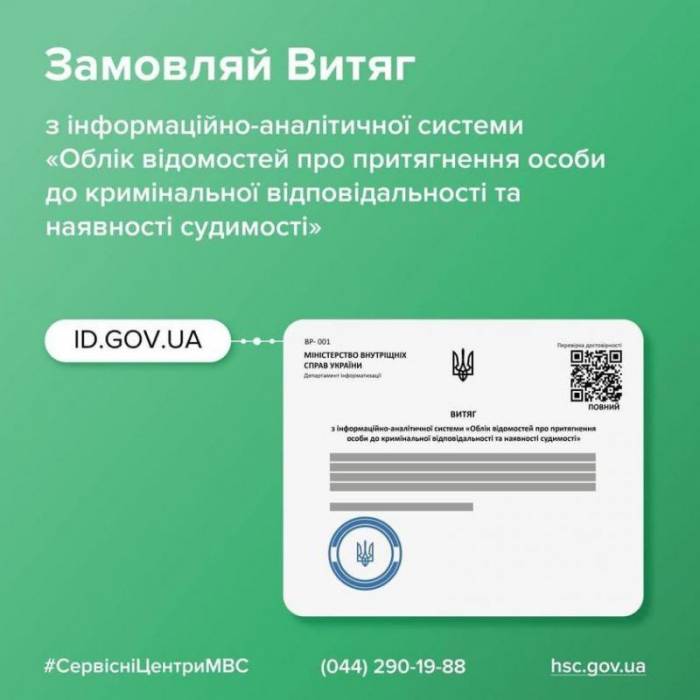 Довідку про несудимість замінив витяг з інформаційно-аналітичної системи «Облік відомостей про притягнення особи до кримінальної відповідальності та наявності судимості».Отримати його можна за лічені хвилини у режимі онлайн https://vytiah.mvs.gov.ua Достатньо увійти до «Особистого кабінету». Перед цим пройти ідентифікацію через сервіс ID.GOV.UA. Після авторизації заповнюємо всі поля і надсилаємо запит. Його автоматична обробка відбувається практично миттєво . Вже за кілька хвилин в "Особистому кабінеті" з'являється витяг в електронному вигляді з QR-кодом, який дає змогу перевірити чинність документу. Зауважимо, так, як витяг є електронним документом, то апостиль на ньому не ставиться, оскільки це не передбачено законодавством. Головний сервісний центр МВС |