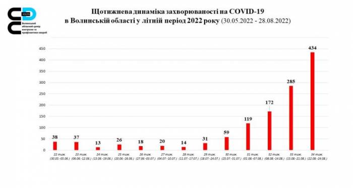 Центр контролю та профілактики хвороб здійснює постійний епідеміологічний нагляд за станом інфекційної захворюваності серед населення у Волинській області. ![]() За даними епіднагляду в області спостерігається ріст захворюваності коронавірусною хворобою COVID-19 на 52,3% в порівнянні з попереднім тижнем. Вдвічі зросла кількість хворих дітей. За 34 тиждень (22.08-28.08.2022р.) на Волині зареєстровано 434 випадки захворювання на COVID-19 (в тому числі дітей – 60, медичних працівників — 18): Луцький район – 290 хворих Володимирський район – 68 хворих Камінь — Каширський район – 20 хворих Ковельський район – 56 хворих Госпіталізовано – 55 осіб (13%), 379 лікуються амбулаторно. За тиждень одужало — 117 осіб, летальних випадків не зареєстровано. Всього в області з початку пандемії захворіло 143434 особи, в тому числі 12498 дітей. Одужало – 140175 осіб, померло — 2455. Методом ПЛР з початку епіднагляду в області обстежено 488909 осіб, в тому числі за останній тиждень – 542 особи. ![]() Вакцинальна кампанія проти COVID-19 триває. Протягом звітного тижня проведено 710 щеплень. Першою дозою щеплено — 138 осіб, другою дозою – 50 осіб, додатковою дозою – 0, першою бустерною дозою – 488 осіб, другою бустерною дозою – 34 особи. Загалом від початку вакцинальної кампанії отримали одну дозу – 353 156 людей, отримали дві дози – 339861 людина, отримали додаткову дозу – 469 людей, першу бустерну дозу – 30990 людей, другу бустерну дозу – 204 людини. Загалом проведено 724683 щеплення. Область забезпечена в достатній кількості вакцинами КОРОНОВАК та ЯНССЕН (Джонсон), вакцинація проти COVID-19 доступна кожному! Щоб отримати щеплення, слід звернутися до сімейного лікаря, або в найближчий до центр чи пункт вакцинації. Перелік пунктів та центрів за посиланням: https://bit.ly/vaccinationpoints |