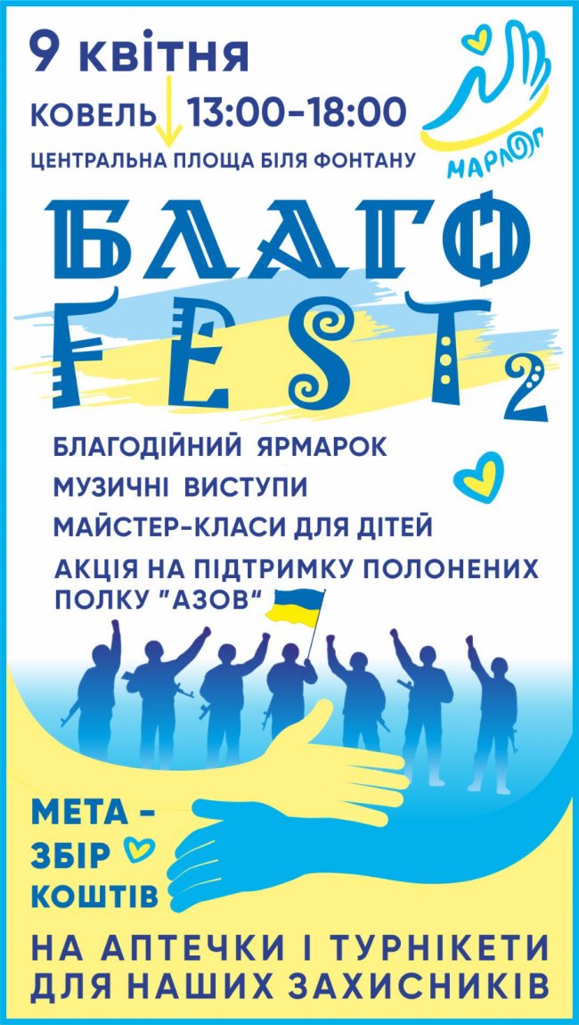 Ковельчан та гостей міста, майстрів та добродіїв із усієї України запрошують на благодійний фестиваль-ярмарок «БЛАГОФЕСТ-ІІ», який відудеться 9 квітня о 13.00 до 18.00 на центральній площі біля фонтану. ![]() В програмі фестивалю: - величезний благодійний ярмарок - музична програма - майстер-класи для дітей - акція на підтримку полонених полку Азов Мета фестивалю: збір коштів на аптечки першої допомоги і турнікети для наших захисників на передовій, - повідомляє Міжнародний волонтерський логістичний центр «Марлог» у Фейсбук. Номер координатора-волонтера: Ольга Дзямко 0(68) 033 31 78 📍Хочете подарунок? Завітайте до нас на сторінку 👇 https://www.facebook.com/marlog.ukraine/videos/1237972340478537 |