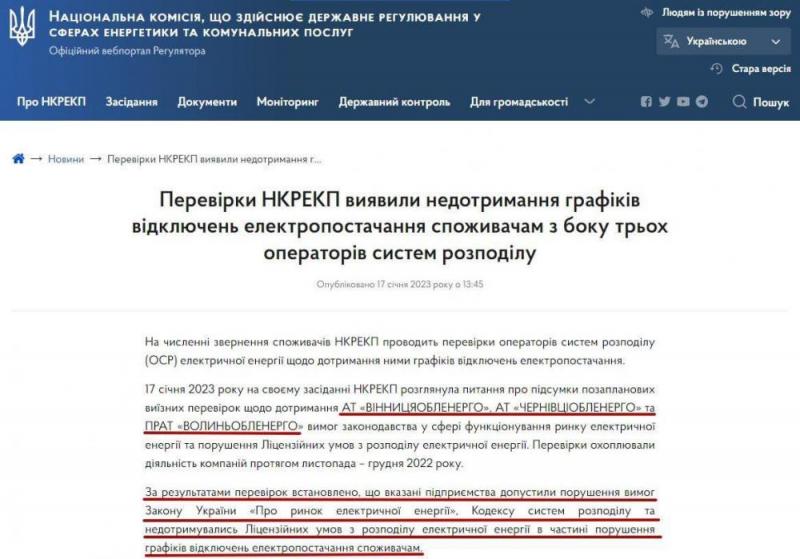 Нацкомісія з енергетики оштрафувала три обленерго за недотримання графіків відключення електроенергії. Йдеться про операторів енергопостачання у Чернівецькій, Вінницькій та Волинській областях. Рішення про штрафи для «Чернівціобленерго», «Вінницяобленерго» та «Волиньобленерего» комісія прийняла на засіданні у вівторок, 17 січня. Сума штрафу для кожної компанії – 85 тис. грн. Крім того, керівникам цих трьох обленерго виписали по 1,7 тис. грн штрафу.Як зазначається у повідомленні прес-служби Національної комісії з регулювання у сферах енергетики та комунальних послуг, під час перевірок обленерго фахівці виявили недотримання графіків відключення електроенергії та порушення ліцензійних умов. Зокрема, Нацкомісія з енергетики уточнює, що Чернівціобленерго», «Вінницяобленерго» та «Волиньобленерего» розподіляли відключення нерівномірно, «без дотримання принципу соціальної справедливості». Крім того, вони неналежним чином інформували споживачів про перерви в електропостачанні, зокрема, через власні сайти. У повідомленні НКРЕКП зазначалося, що скарги надходили на несправедливі відключення: «споживачі вказують, що оператори системи розподілу відключають певні об’єкти постійно та на тривалий час, а певні об’єкти відключають на значно менш тривалий час або взагалі не відключають». «Нацкомісія винесла рішення накласти на АТ «Вінницяобленерго», АТ «Чернівціобленерго» та ПРАТ «Волиньобленерего» санкції у вигляді штрафу у розмірі 85 тис. грн та зобов’язала надалі дотримуватись справедливих графіків відключень, а також вимог щодо належного інформування споживачів про перерви електропостачання», – йдеться у повідомленні. |