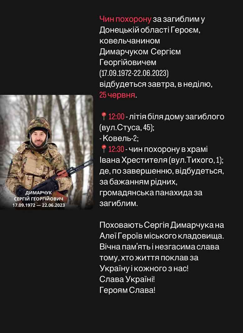 Знову чорна звістка. Загинув у Донецькій області ковельчанин Димарчук Сергій Георгійович (17.09.1972-22.06.2023) Зустрічаємо Героя сьогодні живим коридором о 13:30-13:40 по Незалежності до повороту на вул.Олени Пчілки, - повідомив у Фейсбук Ковельський міський голова Ігор Чайка. ![]() Вічна пам‘ять і слава Герою! ![]() |