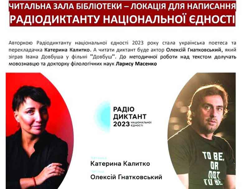 КЗ «Публічна бібліотека» запрошує написати Радіодиктант національної єдності у читальному залі закладу. Цьогоріч він вперше відбудеться 27 жовтня об 11:00 — у День української писемності та мови. Досі це було 9 листопада. Але з 2023 року, згідно з указом Президента, дату змінено. ![]() Відомо, що авторкою Радіодиктанту національної єдності стала українська поетеса та перекладачка Катерина Калитко. А читати текст буде актор Олексій Гнатковський, який зіграв головну роль у фільмі “Довбуш”. Минулого року текст радіодиктанту написала письменниця та режисерка Ірина Цілик. Озвучила – народна артистка Ада Роговцева. Всеукраїнський радіодиктант національної єдності започаткувала команда Українського радіо у 2000 році. Відтоді його проводять щороку. |