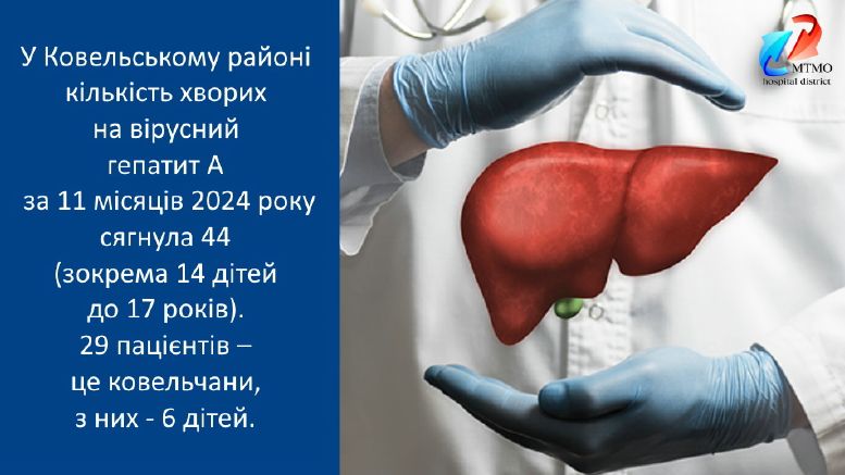 На Ковельщині та в цілому на Волині фіксують зростання захворюваності на вірусний гепатит А. У Ковельському районі кількість хворих за 11 місяців сягнула 44 (зокрема 14 дітей до 17 років). 29 пацієнтів – це ковельчани (з них - 6 дітей). Загалом на Волині від початку 2024 року зафіксовано 105 випадків хвороби. Торік за цей же період - 13. Найефективнішим методом профілактики залишається ретельне дотримання особистої гігієни та, звичайно, вакцинація. Щеплення від гепатиту А є рекомендованими, а не обов’язковими. Тому рішення щодо вакцинації (а відтак і відповідальність) цілком покладається на самого пацієнта ( і робиться за його кошти). Отримати необхідні консультації Ви можете у свого сімейного лікаря або у фахівців в кабінеті інфекційних захворювань поліклініки ЦРЛ Ковельського МТМО. Що необхідно знати про гепатит А? Збудник потрапляє в організм та вражає печінку через заражену їжу, воду та при тісному фізичному контакті з інфікованою людиною. Найчастіше гепатит A супроводжують такі симптоми: