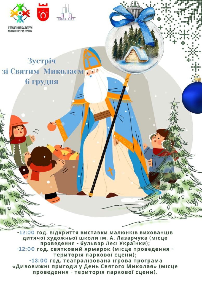 ![]() Завтра, 6 грудня, у День Святого Миколая у Ковелі: 12.00 год. – відкриття виставки малюнків вихованців дитячої художньої школи імені А. Лазарчука (бульвар Лесі Українки); 12.00 год. – святковий ярмарок (територія паркової сцени); 13.00 год. – театралізована ігрова програма “Дивовижні пригоди у День Святого Миколая” (територія паркової сцени); 16.00 год. – благодійний ярмарок хенд-мейду та смаколиків “Разом з нами Миколай, ЗСУ допомагай” ( публічна бібліотека). |