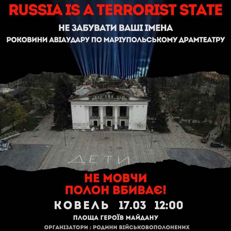 У Ковелі 17 березня о 12.00 год. на площі Героїв Майдану до роковин авіаудару по Маріупольському драмтеатру відбудеться акція «Не мовчи! Полон – вбиває». ![]() Організатори – родини військовополонених. Прийти і підтримати акцію може кожен. Це можливість стати їх голосом і не дати забути про тих, хто вже понад два роки знаходиться в полоні! |