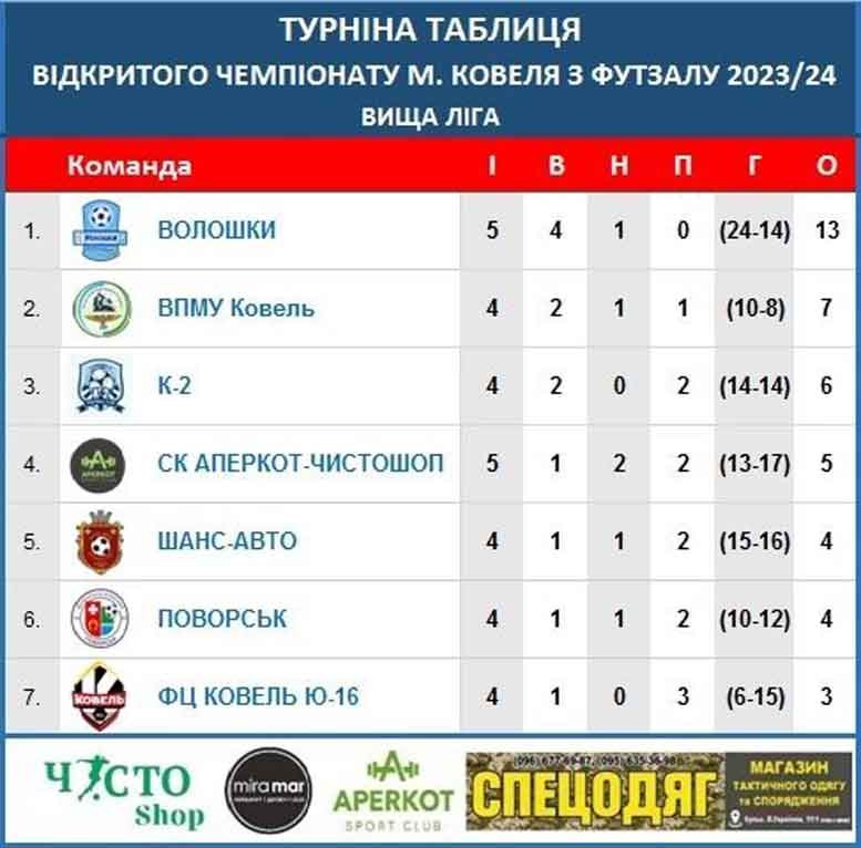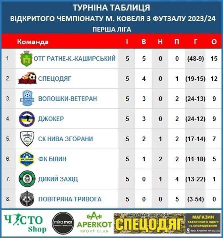 Минулими вихідними в КЗ ДЮСШ ім. Євгена Кондратовича відбувся 5 тур відкритого чемпіонату Ковеля з футзалу 2023/24, в якому беруть участь 15 команд. ![]() До вашої уваги результати зіграних матчів: Вища ліга: 4:0 “СК Аперкот-чистошоп” — “ФЦ Ковель U-16” 4:4 “Волошки” — “ВПМУ Ковель” 4:2 “К-2” — “Поворськ” ![]() Перша ліга: 3:4 “СК Нива Згорани” — “Джокер” 3:2 “Спецодяг” — “Дикий захід” 1:11 “Повітряна тривога” — “Волошки-Ветеран” 8:3 “ОТГ Ратне-К.Каширський” — “ФК Білин” ![]() Нині турнірну таблицю Вищої ліги очолюють “Волошки”, Першої ліги — “ОТГ Ратне-К.Каширський”. Наступний, 6 тур чемпіонату відбудеться 21 січня. Запрошуємо вболівальників футболу підтримати своїх фаворитів! |