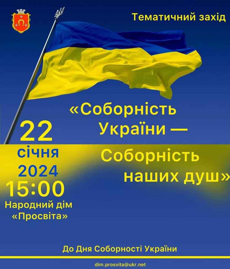 22 січня о 15.00 в Народному домі “Просвіта” з нагоди Дня Соборності України відбудеться тематичний захід “Соборність України — Соборність наших душ”.