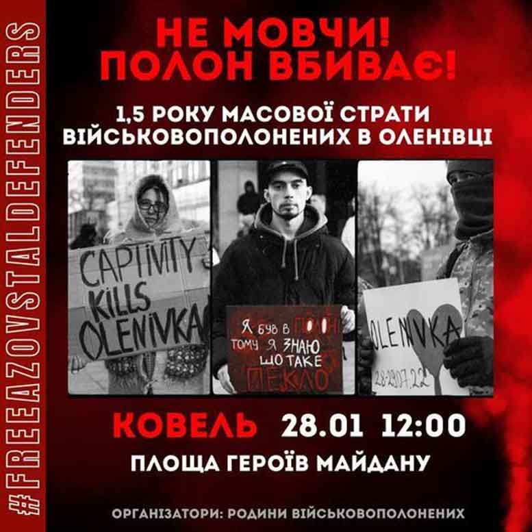 У Ковелі 28 січня о 12.00 год. на площі Героїв Майдану відбудеться акція «1,5 року масової страти військовополонених в Оленівці. Не мовчи! Полон – вбиває». ![]() Організатори – родини військовополонених. Читайте також: У КОВЕЛІ ВКОТРЕ ОРГАНІЗУВАЛИ АКЦІЮ НА ПІДТРИМКУ ПОЛОНЕНИХ |