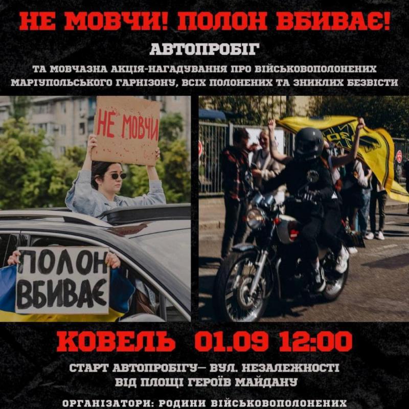 У Ковелі в неділю, 1 вересня, о 12.00 год. відбудеться автопробіг та мовчазна акція-нагадування про військовополонених та зниклих безвісти «Не мовчи! Полон – вбиває».Старт – вул. Незалежності (від площі Героїв Майдану). Організатори – родини військовополонених. |