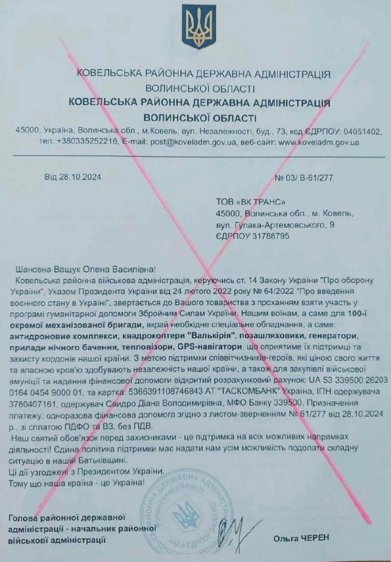 ![]() Зловмисники розсилають листи нібито від Ковельської районної державної адміністрації «з проханням взяти участь у програмі гуманітарної допомоги Збройним Силам України». Наголошуємо, Ковельська районна державна адміністрація НЕ надсилає таких листів. При отриманні подібних звернень, повідомляйте про них правоохоронні органи. Будьте уважні та перевіряйте інформацію, перш ніж перераховувати кошти. |