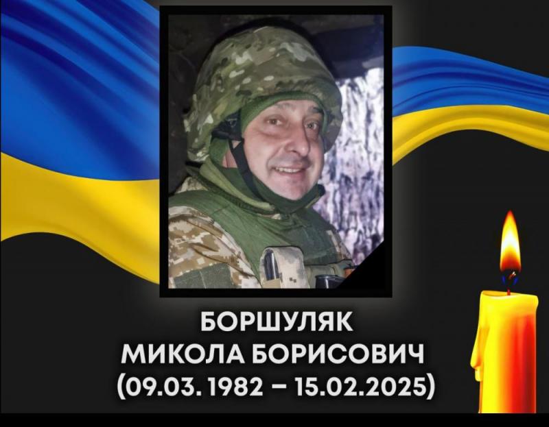 ![]() З глибоким сумом повідомляємо про чергову втрату у нашій громаді. Війна забрала життя старшого солдата Боршуляка Миколи Борисовича (09.03.1982 р.н.), командира єгерського відділення 2-го єгерського батальйону в\ч А 4056. Він загинув 15 лютого 2025 року, виконуючи бойове завдання в районі населеного пункту Новоукраїнка Покровського району Донецької області. Прощання з бійцем та чин похорону відбудеться 25 лютого 2025 року за наступним порядком: