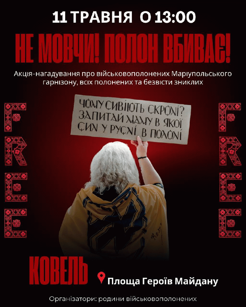 ![]() У Ковелі в неділю, 11 травня, в центральній частині міста відбудеться мовчазна акція-нагадування про всіх військовополонених та зниклих безвісти «Не мовчи! Полон – вбиває». Організатори – родини військовополонених. |