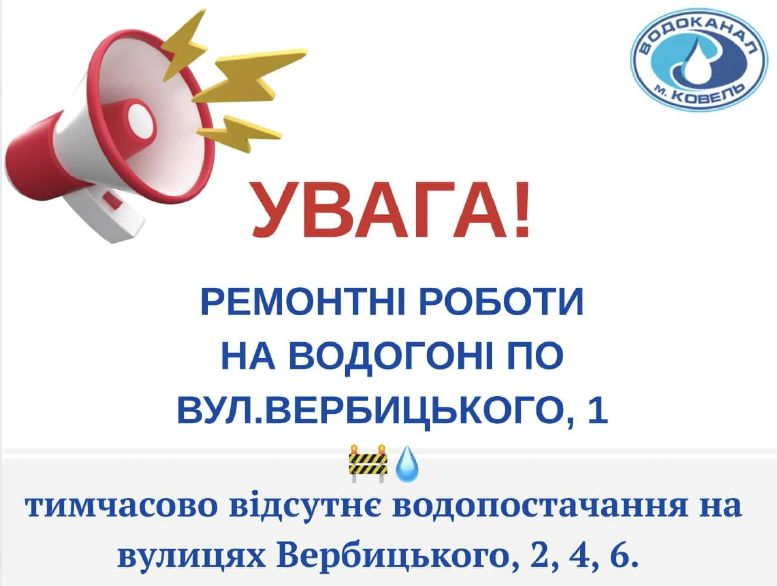 ![]() ПРОВОДЯТЬСЯ РЕМОНТНІ РОБОТИ НА ВОДОГОНІ ПО ВУЛ. ВЕРБИЦЬКОГО, 1 У зв’язку з ремонтними роботами тимчасово припинено водопостачання за адресами: