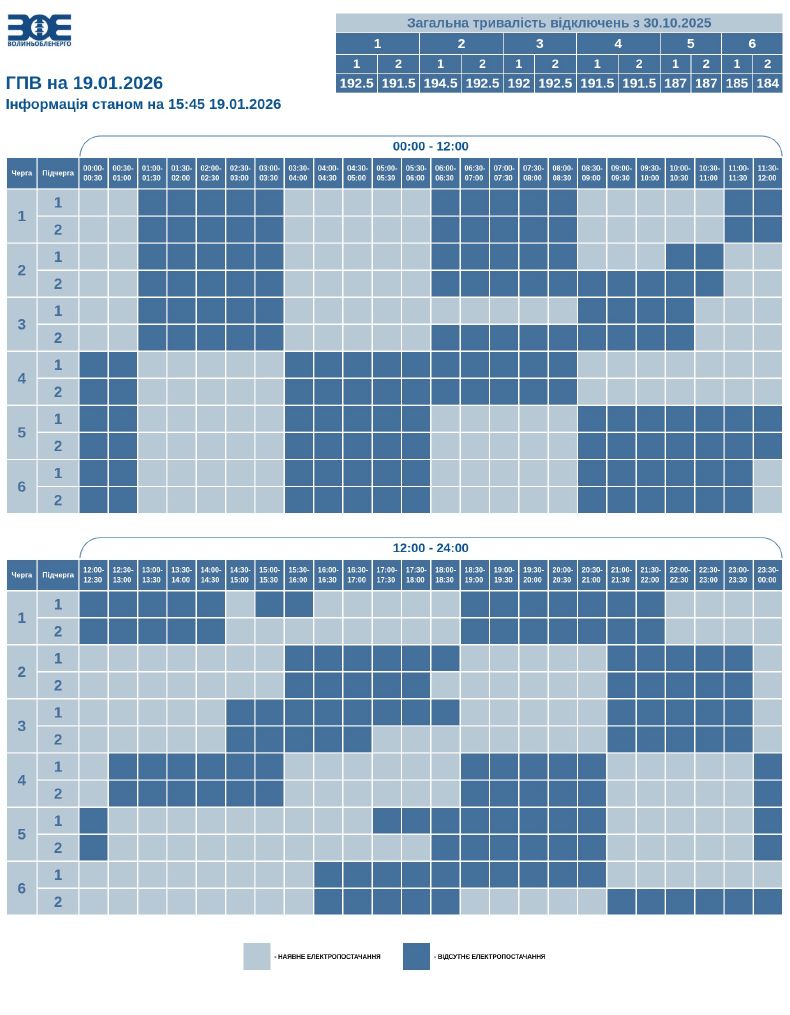 В українській енергосистемі зберігається дефіцит потужності. Причина - наслідки масштабних пошкоджень енергетичної інфраструктури. НЕК «Укренерго» доводить ПрАТ «Волиньобленерго» обсяги обмеження споживання електричної енергії на наступну добу у кожну конкретну годину (кількість черг, що необхідно застосувати). Зазначаємо, що порядок та кількість введення черг ГПВ може коригуватися згідно із розпорядженням диспетчера НЕК «Укренерго» протягом доби. Ситуація динамічна - можливі екстрені відключення поза графіком у разі, якщо у НЕК «Укренерго» буде необхідність збалансувати енергосистему. Час відключення та відновлення електропостачання може відрізнятись від заявленого у графіку на 20-30 хвилин. Таке відхилення пов'язане із технологічним процесом перемикання черг службами «Волиньобленерго». Інформація щодо графіків погодинного відключення актуалізується кожні 60 хвилин. Оновлено: 19-01-2026 16:00 |
