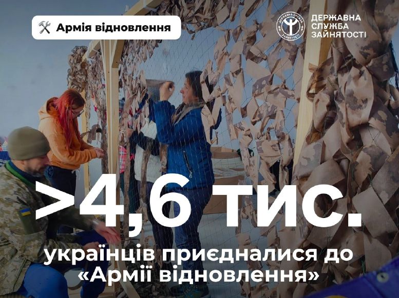 З початку цього року вже понад 4,6 тисячі українців взяли участь у суспільно корисних роботах (СКР) в межах проєкту «Армія відновлення». Загалом за час реалізації цього проєкту, з жовтня 2022 року, видано понад 336 тис. направлень. На виплату заробітної плати учасникам проєкту спрямовано 2,9 млрд. гривень. Учасники проєкту залучені до реалізації суспільно корисних ініціатив і до відбудови інфраструктури країни. Найпоширенішими напрямами робіт є: